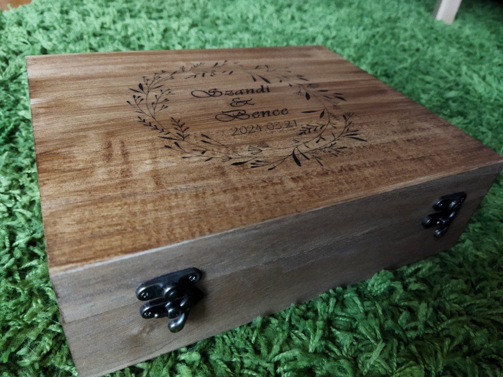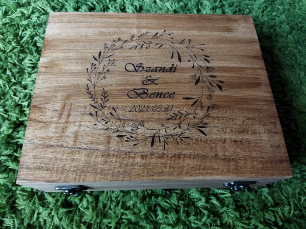Kívül, belül gravírozott doboz esküvői ajándékként.