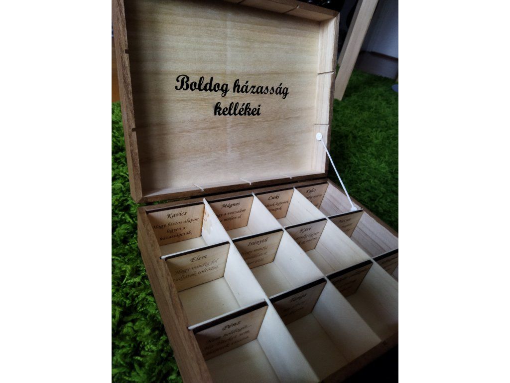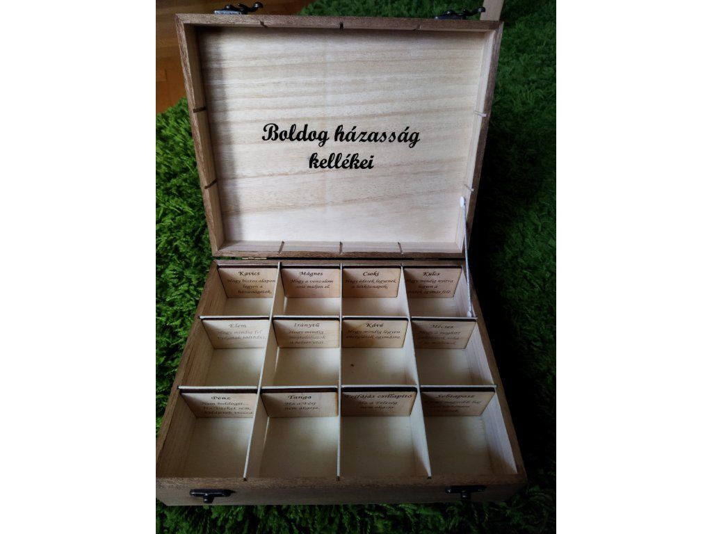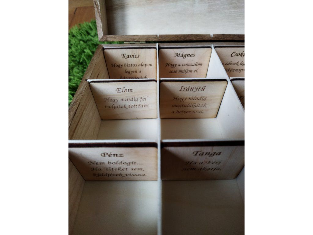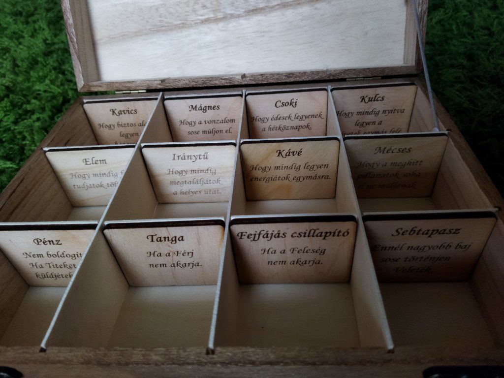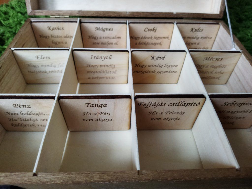 Esküvői ajándékként gravírozott, egyedi doboz, belül gravírozott fakkokkal.