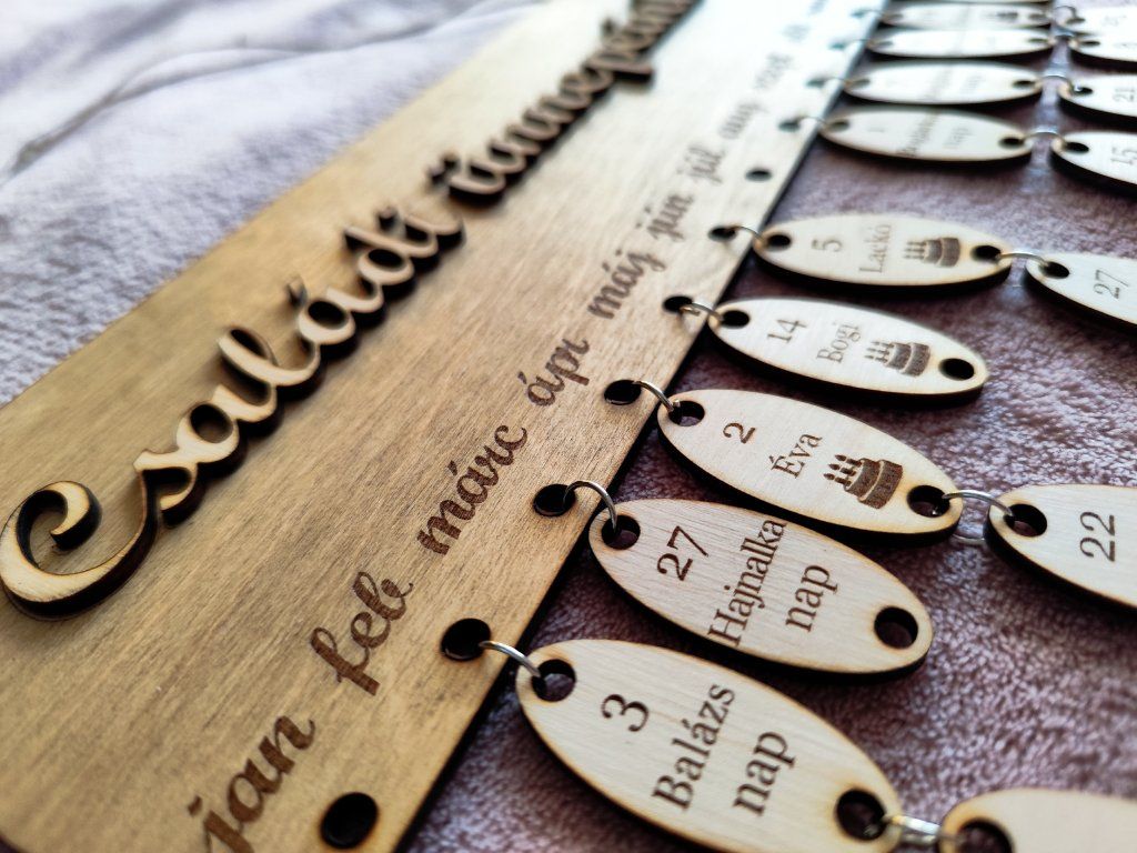 2 rétegből készített fa tábla a családi eseményekről.