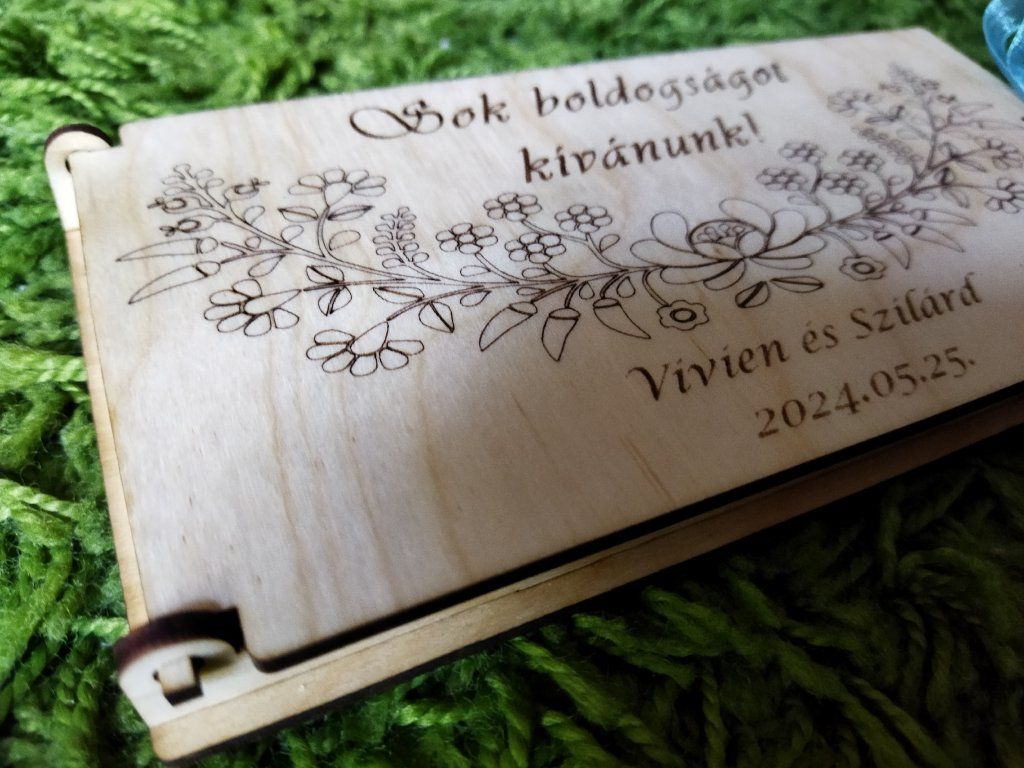 Gravírozott, kinyitható pénzajándékozó doboz.