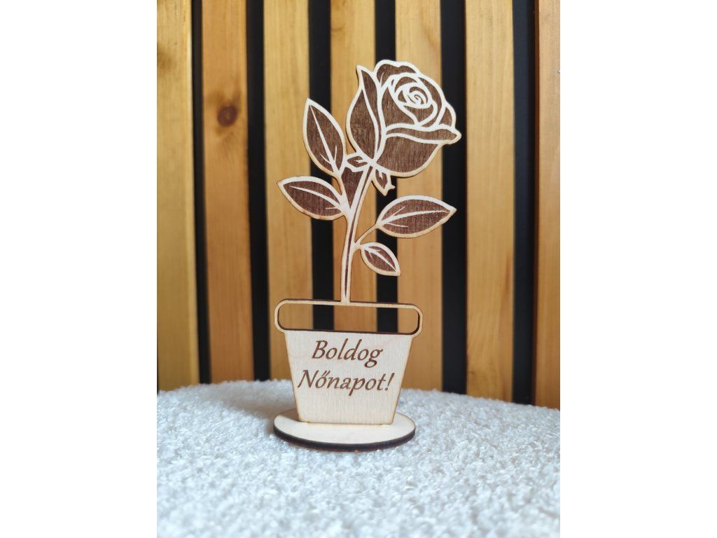 Fából készült gravírozott feliratos rózsa különböző alkalmakra, talppal együtt.
