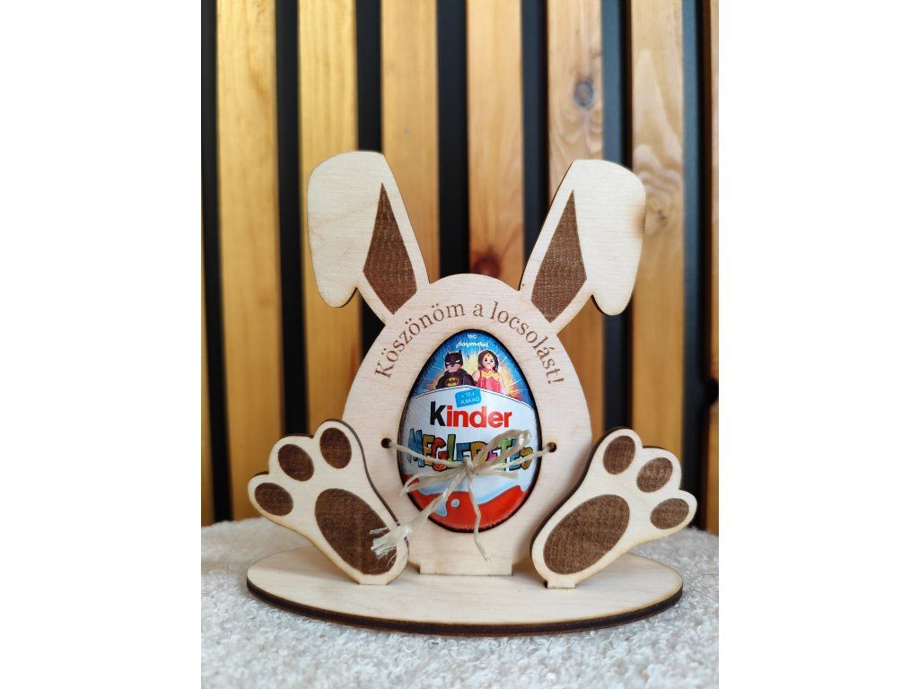 Fából készült tojásajándékozó nyúl. A csomag a csokitojást nem tartalmazza, de a megkötéshez szükséges zsineget igen, illetve a fa nyuszit és talpát.